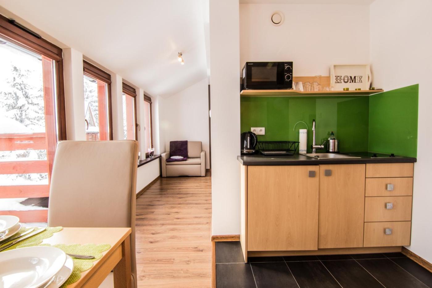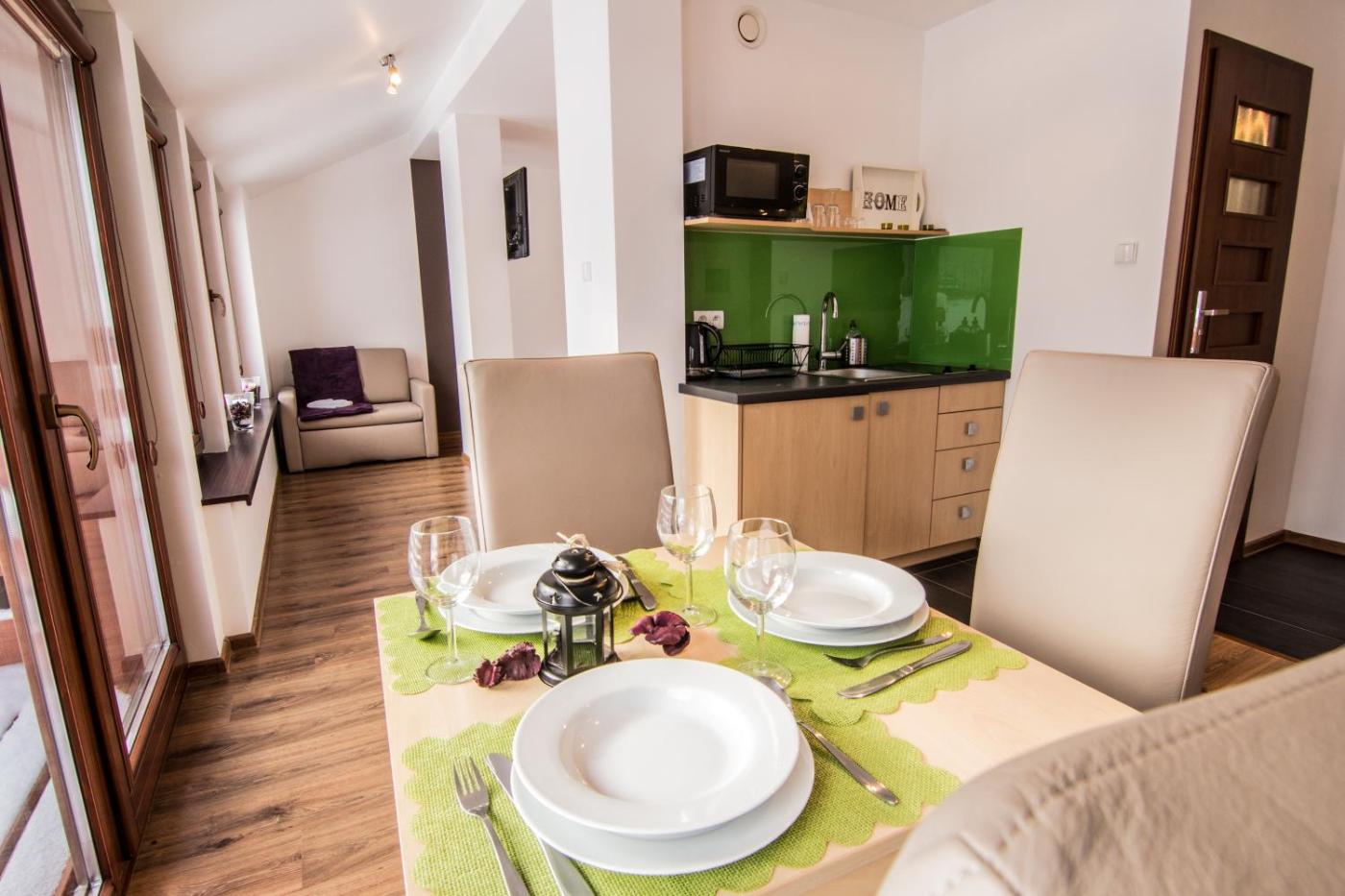 Apartament z 1 sypialnią (budynek nr 32). Featuring a private entrance, this apartment also comprises 1 bedroom, a seating area and 1 bathroom with a shower and a hairdryer. The well-fitted kitchenette features a stovetop, a refrigerator, kitchenware and a microwave. Boasting a balcony with garden views, this apartment also provides a dining area and a flat-screen TV. The unit offers 2 beds. Apartament - 4 osobowy. Powierzchnia pokoju ok.: 36 mkw. ;