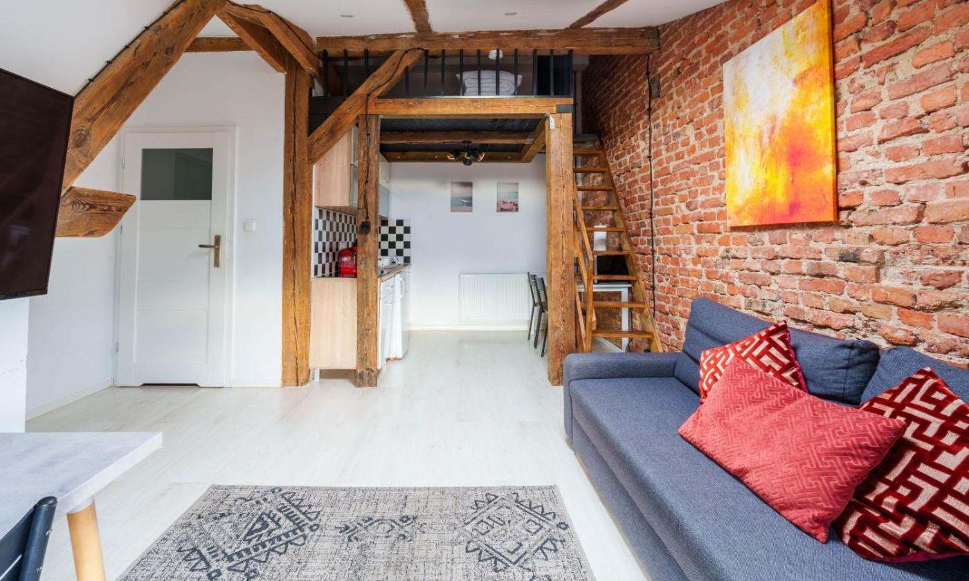Apartament typu Standard. This apartment is comprised of 1 living room, 1 separate bedroom and 1 bathroom with a shower and a hairdryer. Guests can make meals in the kitchenette that comes with a stovetop, a refrigerator, kitchenware and an oven. The apartment features tiled floors, a seating area with a flat-screen TV, a washing machine, a tea and coffee maker as well as ancourtyard view. The unit offers 3 beds. Apartament - 5 osobowy. Powierzchnia pokoju ok.: 30 mkw. ;