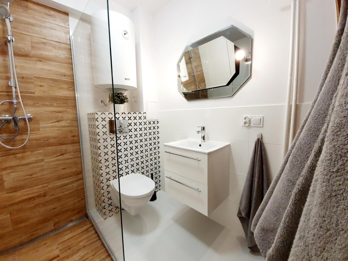 Apartament z 3 sypialniami. This spacious apartment features 1 living room, 3 separate bedrooms and 1 bathroom with a shower. The well-equipped kitchen has a stovetop, a refrigerator, kitchenware and an electric kettle. Boasting a balcony, this apartment also features a washing machine, a dining area and a flat-screen TV. The unit has 4 beds. Apartament - 8 osobowy. Powierzchnia pokoju ok.: 70 mkw.